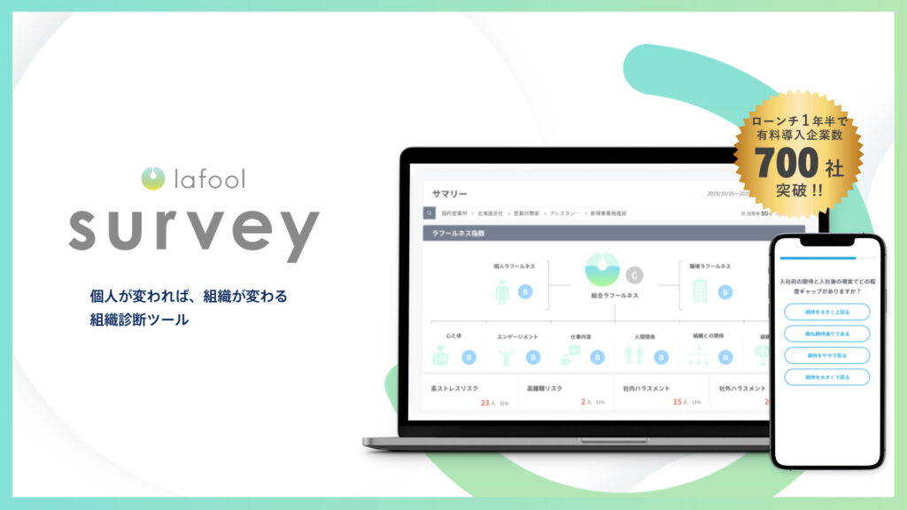 今後も引き続き、お客様のご意見、ご要望から、更にご活用いただきやすいサービスにしていけるよう開発・運営を進め、『ラフールサーベイ』におけるサービス体験の向上に取り組むことで、組織の健康経営促進をサポートしてまいります。
